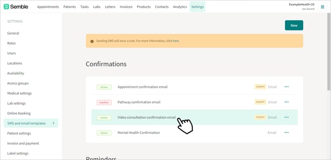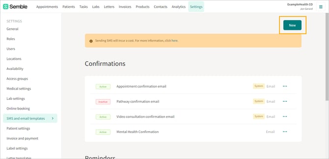 Note: To set up automated messages for your practice, you must have a role assigned to you that gives you access to the SMS and Email Templates tab in Settings. For more information on roles, see here.