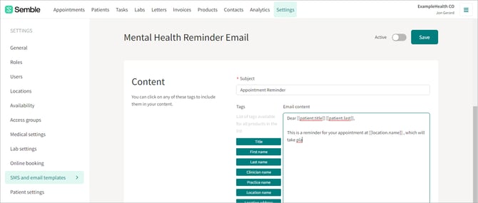 4. Enter the content for the email or SMS. You can directly type in the text editor, or click on the Tags to insert customised information, such as a patient's last name.