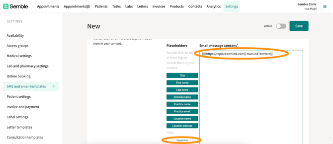 You can now add a hyperlink to your emails and sms, this can be done by clicking the hyperlink button as circled and the placeholder in the "Email message content" will appear: