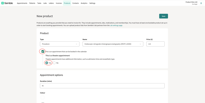 Note: Make sure that the 'This product can be booked in the calendar' box is ticked, as well as 'This is a theatre appointment.'