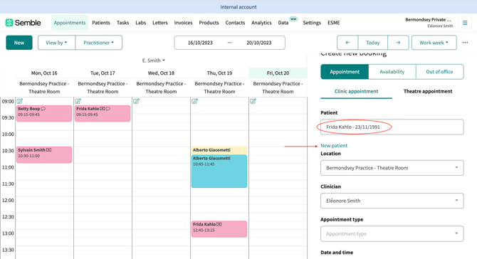 4.Select the patient who you want to make the appointment for. You can also select New patient to create a new patient for the appointment.