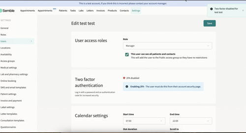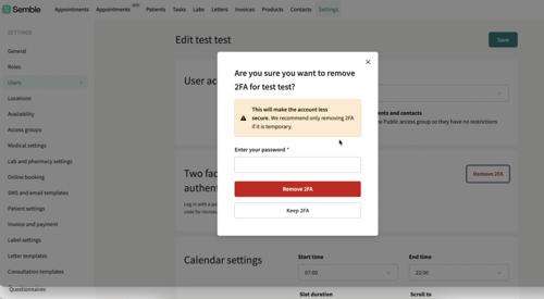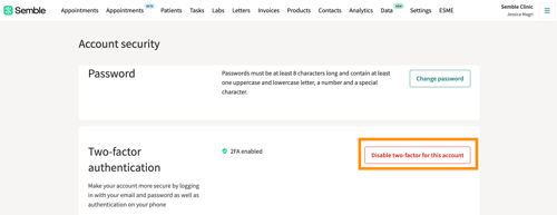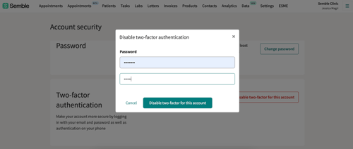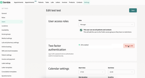 If you need to remove your 2FA due to not having access to your 2FA app, kindly contact your clinic manager about this, they will be able to follow the steps below, if you are the only user on your account with a "Manager" role then please contact support@semble.io.