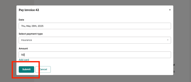 2. Select the relevant payment type (eg. “Insurance”) and adjust the amount paid by the insurer (e.g. £50.00), then submit the payment.